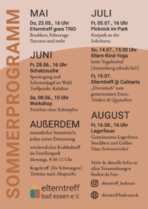 Kennenlernen und Austausch mit anderen Familien mit Kindern von 0 bis ins Grundschulalter. Oft bieten wir kleine Events, wie z.B. Bastelaktionen für Kinder an.